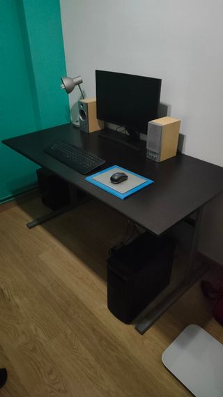 COMPRADO HACE 3 MESES Esta nuevo no tiene ninnguna ralladura, muy cuidado siempre me caben 2 pantallas y un portátil es un escritorio muy grande ( medidas en las fotos ). En ikea 179€ Un diseño de líneas sencillas y bonito se mire por donde se mire. Puedes ponerlo en el centro de la habitación o contra una pared, ya que los cables quedan ocultos. Coloca otra superficie de trabajo extraíble en el lateral izquierdo o derecho.