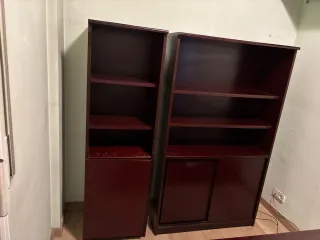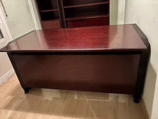 Mesa de despacho de madera, color marrón oscuro -wengué. Con extensión semi-circular, extraíble, para facilitar reuniones. Medidas: 160 x 80 cm, sin extensión semicircular. 200 x 80 cm, con la extensión. Con buc de tres cajones, con ruedas, para poder escoger ubicación (derecha o izquierda). Con agujero pasa-cables, en el lado derecho. En general, en buen estado. Algunas marcas de uso, poco visibles. Con soportes en la parte interna lateral derecha, para PC (extraíbles). Posibilidad de poder comprar mobiliario extra, que se ve en las fotos: silla ruedas, estanterías, armario. Precio a negociar.