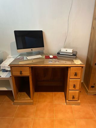 Escritorio de despacho para ordenador de madera maciza con bandeja extraíble para teclado, amplio hueco inferior dividido (ideal para impresora y torre de PC) y acabado tipo caoba oscuro. Está en buen estado general —uso doméstico— con marcas leves normales por el tiempo. Medidas: Ancho 90 cm Largo 56 cm Alto 75 cm Bandeja teclado 42x73 Bandeja impresora 40x50 Espacio Torre PC 21x58x55 Entrega en mano en Rincon de la Victoria y ahorro del 10%. Precio 220€(negociable).