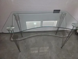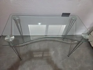 Elegante mesa con superficie de cristal y patas de metal. - Diseño moderno y minimalista. - Patas finas y estilizadas. - Tablero curvo. - uso como para despacho o entrada