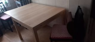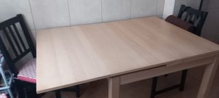 Mesa de comedor extensible de Ikea, modelo Ekedalen. Amplía su capacidad de 180 cm a 240 cm. - Diseño moderno y funcional. - Acabado en madera clara. - fácil montaje - en muy buen estado. - a diferencia de otras mesas, las patas no se quedan en medio, así no estorban a nadie. - el precio ya está muy ajustado. - Me he mudado y no me va bien en el salón. Cuando la compré el pestillo para ampliar la mesa no funcionaba, pero no afecta para abrir o cerrar. Por lo demás está muy bien.
