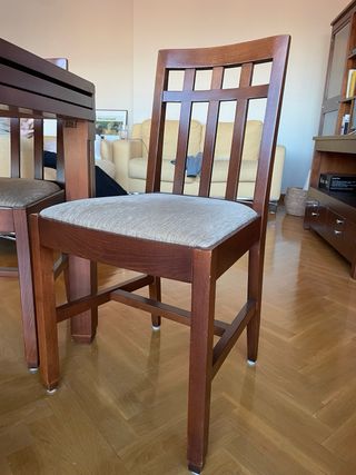 Conjunto de mesa de comedor extensible con cuatro sillas a juego, fabricado en madera. - Mesa de comedor cuadrada extensible (1,46m). Se puede desmontar. - Cuatro sillas de madera con asiento tapizado.