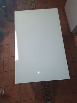 Mesa de cristal templado con estructura metálica, ideal para espacios reducidos. Se encuentra en muy buen estado. Medida cerrada 110x70 - Superficie de cristal templado blanco - Mecanismo extensible con 2 alas, cada una de 30 cm. - Patas de metal color gris. No envío. Recogida en domicilio Abstenerse contraofertas