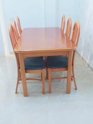 Conjunto de mesa de madera maciza con seis sillas a juego. Ideal para comedor o salón. 160cm de largo extensible a 240cm. para 12 comensales. en muy buen estado, tan solo algún rasguño en esquina - Mesa de madera maciza. - Incluye 6 sillas.