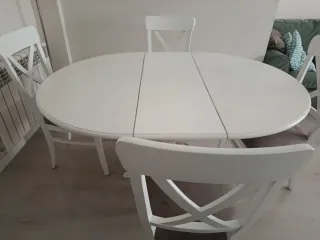 Se vende mesa de comedor en color blanco con diseño moderno y funcional. La mesa es abatible/extensible, ideal para ahorrar espacio cuando no se utiliza y ampliar su capacidad cuando sea necesario. Incluye 4 sillas con estructura metálica cromada y asiento/respaldo en tono crema claro, muy cómodas y en perfecto estado. Ideal para comedor, cocina o espacios pequeños Estado: como nueva Estilo minimalista y fácil de combinar ¡Lista para usar y perfecta para cualquier hogar! Si se realiza sin envio, el precio se queda en 150€