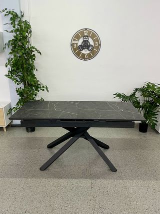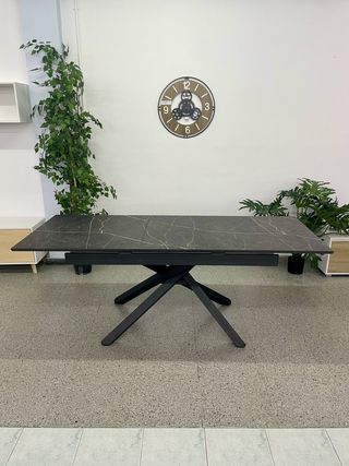 Mesa de comedor con un diseño moderno y funcional, perfecta para cualquier hogar. - Tablero con acabado en madera. - Patas de metal negro. - Diseño extensible para adaptarse a tus necesidades. No se envía, se recoge en persona en Almeria capital.