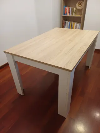 Mesa de comedor con un diseño moderno y elegante. La mesa tiene los filos de las patas inchados de la fregona, tiene un corte de una mudanza y los tornillos de dentro un poco flojos que se arregla poniendo los tornillos en otro lugar para que apreten bien, la madera está en buenas condiciones. Cerrada es de 140cm, con el extensible 180cm. - Patas de madera. - Tonos grises y blancos.