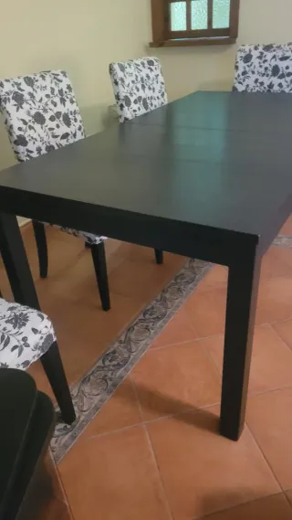 Mesa de comedor de madera en color negro. Su diseño es moderno y elegante, ideal para cualquier hogar. Extensible al sacar el suplemento debajo del centro de la mesa. Se encuentra en Roquetas de Mar - Acabado liso y uniforme. - Patas robustas para mayor estabilidad.
