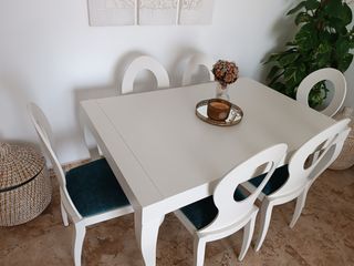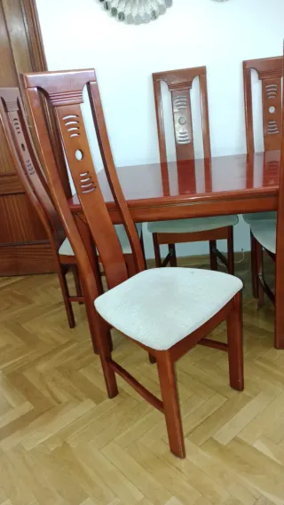 Vendo hermoso conjunto de mesa y sillas antiguas de madera maciza, ideal para comedores con un toque clásico. La mesa es extensible, permitiendo ajustar su tamaño según las necesidades (ver fotos), perfecta para reuniones familiares o eventos especiales. Acompañada de 6 sillas robustas, con diseño artesanal, cómodas y elegantes, que combinan a la perfección con la mesa.En buen estado general, con marcas naturales del tiempo que aportan carácter y autenticidad.Precio negociable. ¡No pierdas la oportunidad de darle un toque elegante y vintage a tu comedor! Precio negociable