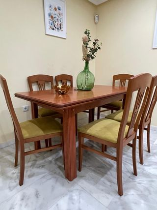Preciosa mesa de comedor de madera de 1,40m, extensible a 2,40m, en color marrón. Incluye seis sillas a juego. La mesa está en buen estado, con algunas señales normales de uso. - Extensible para adaptarse a tus necesidades. - Ideal para seis comensales. - Diseño clásico y elegante.