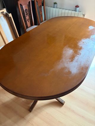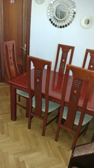Mesa de comedor extensible ,(500€ sólo la mesa). También vendemos las seis sillas de comedor (300€ las 6 sillas). Están en muy buen estado, tan solo tienen algunas mariquitas típicas del uso.