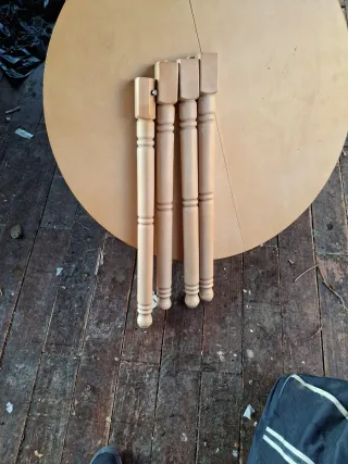 Mesa redonda de madera con un diseño clásico y cuatro patas desmontables. - Tablero redondo. - Cuatro patas de madera torneada. Extensible Cerrada Cerrada 90 Abierta 122 de largo y ancho 90