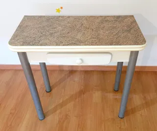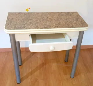 Vendo mesa de cocina extensible con cajón frontal. Medidas: Cerrada: 80 × 40 cm Extendida: 80 × 80 cm Altura: 75 cm La extensión funciona correctamente. Estado usado, tal y como se ve en las fotos. Recogida en ciruelos. No se envía. El comprador se encarga de la recogida.