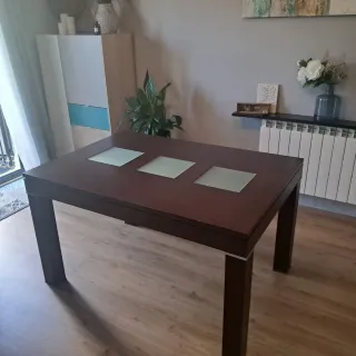Elegante mesa de comedor extensible con un diseño moderno.Color wengue y cristal templado. Madera maciza Medidas: 90x130x75 fija con extensión (65cm) 90anchox195largox75 alto Pequeñas marcas de uso. - Tablero de madera oscura. - Inserciones cuadradas de cristal en el centro. - Patas robustas de madera.