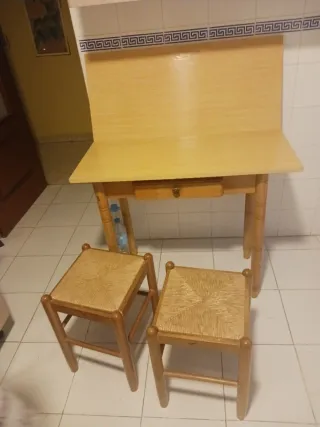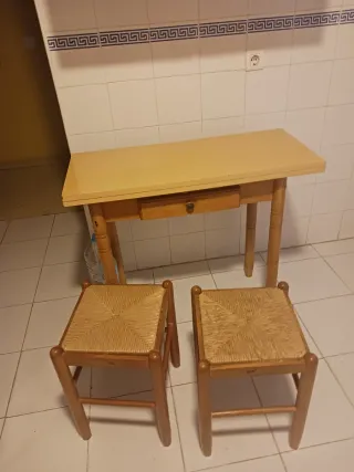 Conjunto de mesa de cocina extensible con un cajón y dos taburetes.Recoger en el sitio.Badajoz capital. - Mesa con superficie de madera clara. - Un cajón central con tirador. - Dos taburetes con asiento de esparto.