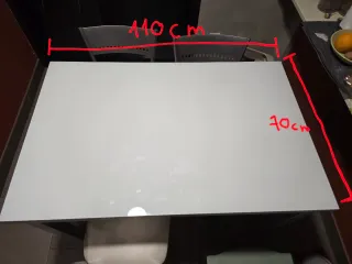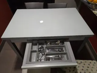 Mesa de comedor extensible abriendo y añadiendo las láminas blancas que se guardan debajo. Se puede añadir una lámina o dos, según cuánto la quieres agrandar. Mide 140 x 84cm sin extender No está desmontada. Sillas no incluidas.