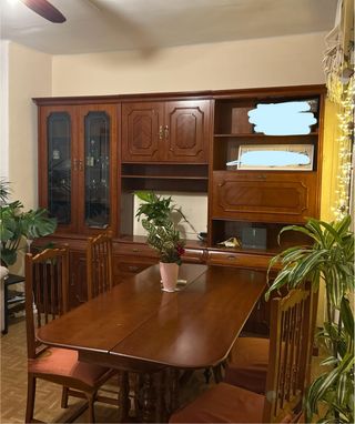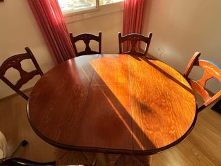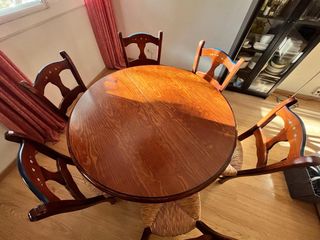 Vendo conjunto completo de mesa de comedor extensible de madera maciza con 6 sillas, en buen estado y muy sólida. La mesa es redonda y extensible, con sistema de apertura central integrado. • Medidas cerrada: 120 x 120 cm • Medidas abierta: 120 x 160 cm • Estructura estable, sin holguras • Superficie bien conservada, con marcas leves de uso normal Las sillas son de madera maciza, con asiento de enea natural trenzada, cómodas y resistentes. • 6 unidades • Estructura firme • Pequeños signos estéticos del uso, sin afectar funcionalidad Conjunto robusto y duradero, ideal para comedor principal.