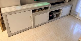 Mueble de salón con un diseño moderno y acabado rústico, ideal para complementar tu espacio. - Acabado en madera clara con detalles desgastados. - Puertas con tiradores plateados. - Compartimentos abiertos y cerrados para almacenamiento. Se compone por: -Mesa de comedor 135x 90cm extensible, 4 sillas ( 30€ mas ) aparador 150x90x40 y mueble de televisión 257 cm x 30 cm.