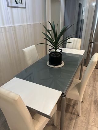 Mesa de cocina extensible en buen estado. Su diseño moderno combina a la perfección con cualquier decoración. - Tablero de cristal. - Estructura de metal. - Extensible para mayor capacidad.