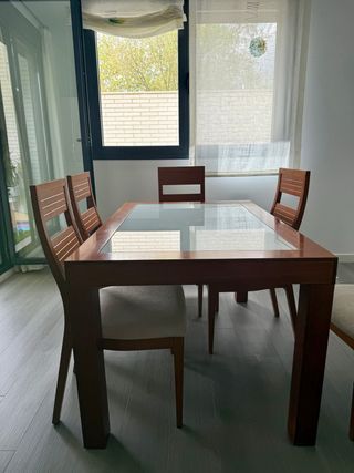 Mesa de comedor extensible con superficie de cristal y estructura de madera. - Diseño moderno y funcional. - Ideal para espacios reducidos o para ampliar cuando hay invitados.