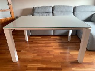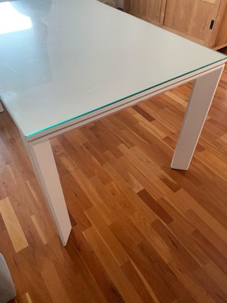 Mesa de salón de 120 cm extensible a 240 cm. Con doble cristal para cuando se haga extensible. Una de las patas se pegó y no se puede desmontar, las demás si.