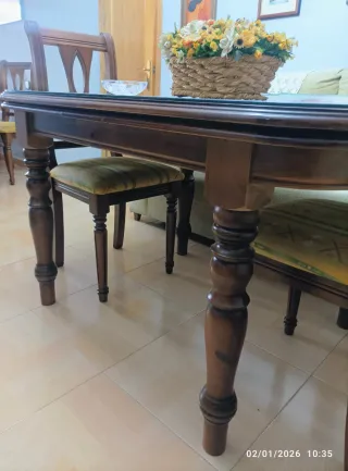 Elegante mesa extensible de comedor de estilo clásico, fabricada en madera maciza con un precioso acabado brillante que realza la veta natural. Cuenta con dos bases robustas con columnas estriadas y forma octogonal, que aportan gran estabilidad y un diseño distinguido. 🔹 Características: Mesa extensible, pasa de 1,50 m a 3 metros de largo. Madera de alta calidad con acabado tipo piano. En muy buen estado general, con ligeras marcas de uso. Color: tono caoba oscuro. 📏 Medidas: Cerrada: 150 cm largo x 90 cm ancho x78 cm de alto Abierta: 300 cm largo x 90 cm ancho 📍 Recogida en mano. 💬 Puedo enviar más fotos