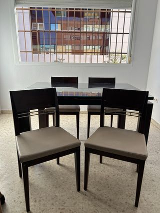 Conjunto de mesa extensible con cuatro sillas a juego. Incluye fundas hechas a medida para las sillas. - Mesa con superficie de cristal. - Estructura de madera oscura. - Sillas con asientos de polipiel negra.