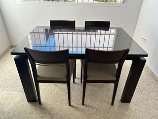 En venta : Mesa de comedor extensible con seis sillas en madera maciza wengué oscuro, remarcada con aplicaciones metálicas en las patas y cobertura en cristal templado. Las sillas en la misma madera tapizadas en color melocotón. En excelente estado por poco uso. Medidas: 75 cms alto, 90 cms ancho y 145 largo. No incluye el transporte al comprador. Interesados/as: llamar al 619852787 cualquier día a partir de las 18.00h gracias.