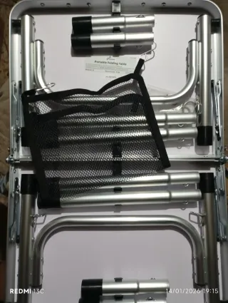 Mesa plegable con dos alturas ajustables. Ideal para camping, picnics o como mesa auxiliar. - Patas extensibles y regulables en altura. - Incluye soportes triangulares para mayor estabilidad. - Accesorios: 2 ganchos y bolsa de malla.