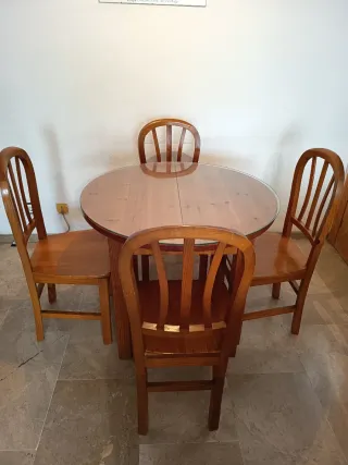 Conjunto de cuatro sillas sin asiento, junto con una mesa extensible. La mesa como se puede apreciar en la foto, es de 1 pie y tiene por algún lado el barníz saltado. Proceden todas de la misma compra. Proporciono también plantilla de madera para el asiento. El estado de los muebles es bastante aceptable. Se puede vender por separado (las 4 sillas o la mesa). - Estructura de madera. - Color marrón.