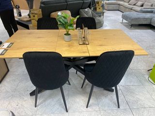 !!atendemos por whats 63*22*47*000 !! ✅Totalmente nuevo y con 2 años de garantia ✅Envios a toda Esapaña y Barcelona pago en persona Conjunto de mesa extensible con cuatro sillas de comedor. - Mesa con tapa de madera y patas metálicas negras. - Sillas tapizadas en negro con diseño acolchado.