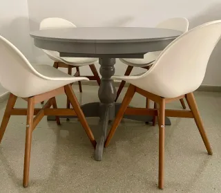 Conjunto de mesa redonda ikea y cuatro sillas. - Mesa redonda de color gris. - Cuatro sillas de color blanco con patas de madera.