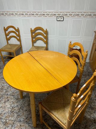Conjunto de mesa extensible y cuatro sillas. - Mesa redonda con acabado en madera con un diámetro de 90cm y 72cm de altura. - Sillas con asiento de fibras naturales. - Al no abrir el extensible a menudo falta engrasar pero se abre bien.