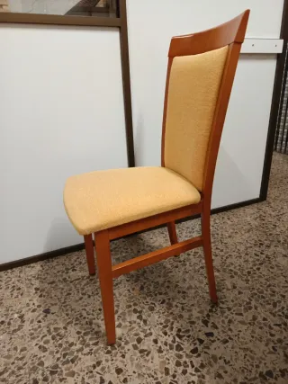 Conjunto de seis sillas de comedor con un diseño elegante y tapizado. - Tapizado en color amarillo. - Estructura de madera. Mesa extensible 120 x 90 (ampliable a 240 x 90) Precio negociable!