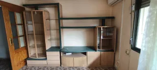 Mueble de salón de madera con vitrinas y cajones. Compuesto por : Mueble de comedor Mesa comedor extensible mas 4 sillas y 2 sillones. Mesa centro elevable