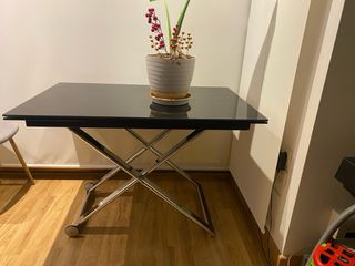 Elegante mesa de comedor con superficie de cristal negro y estructura metálica. - Diseño moderno y funcional. - Patas cromadas en forma de X. - Ruedas para fácil movilidad. - Elevable - Extensible - Medida mesa de largo: 1,10 y abierta 1,75 - Tiene unas ralladuras de una maceta, como defecto, muestra en las últimas fotos