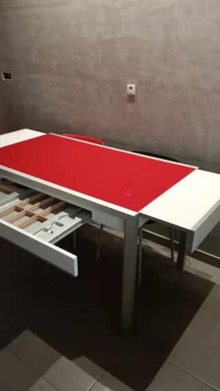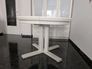Mesa de cocina extensible en ambos lados y cajón frontal, la base es de cristal y está rajado como se aprecia en las fotos . Las medidas son con la mesa cerrada y cada lado extensible mide 27 CMS .