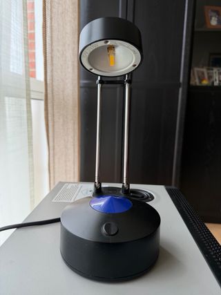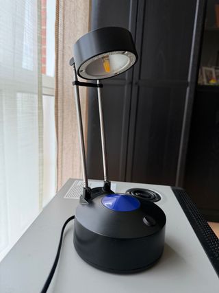 Lámpara de mesa con un diseño vintage. Extensible de 26 a 50 cm. Perfecta para cualquier escritorio o mesita. - Base y estructura en acabado negro. - Detalle en color azul. - Fabricada en metal y plástico.