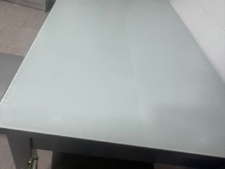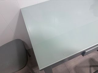 Mesa tipo barra de desayuno con superficie extensible a un fondo de 65. Tiene un rayón.se admiten ofertas - Estructura de metal. - Encimera de cristal.