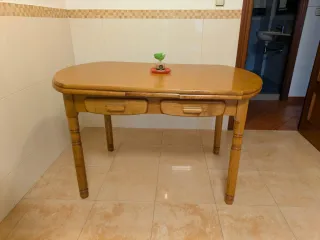 Mesa de cocina con un diseño clásico y funcional. - Acabado en madera natural. - Patas torneadas para un toque elegante. - Dos cajones integrados para almacenamiento adicional. Extensible. Por ambos lados. No se las medidas y no puedo darlas. El precio es muy barato porque me interesa sacarla urgente. Habrá que desmontarla para sacarla. No cabe en el ascensor.