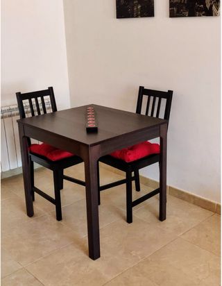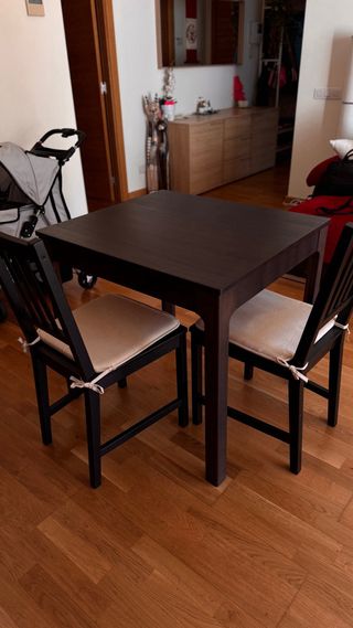 Mesa de comedor con acabado en madera de wengué. - medidas sin abrir 80x70x76cm -extensible. medidas abierta 120x70x76cm - Patas robustas para una mayor estabilidad. - incluye 2 sillas a conjunto con COJINES en beige