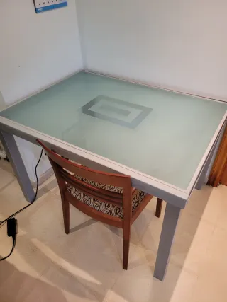 Mesa de comedor (90x90) con un diseño moderno y elegante. - Tablero de cristal - Estructura de metal resistente. Con sillas a juego 80€