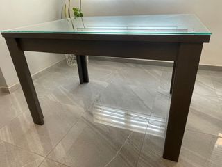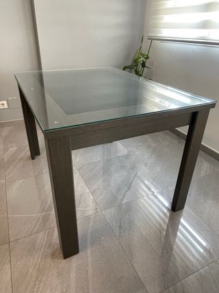 Elegante mesa de comedor con superficie de cristal y estructura de madera (extensible) Diseño moderno Patas robustas Acabado en tono gris ceniza Tablero extensible de 90cm Medidas 120*90*80 120 cm de largo + 50 cm de extensiòn, pudiendo hacer mesa total de 170 cm VENDO POR CAMBIO VIVIENDA. SÒLO SE ACEPTA PARA RECOGER /ENTREGA EN MANO