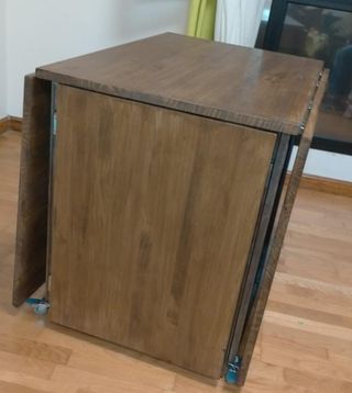 Estupenda mesa salón extensible. 90x90 sin extender , 90×165 extendida. Muy funcional, ideal para gestionar espacios y practicar para acoger invitados en ocasiones especiales. Material de calidad, madera barnizada en tono oscuro. La cambiamos solo porque buscamos otro estilo. A recoger aquí de una pieza , hace falta furgoneta.
