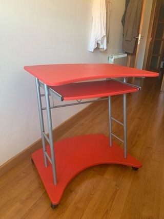 Práctica mesa en color rojo para ordenador con un diseño moderno y funcional. - Bandeja extensible para teclado y ratón. - Estructura robusta y estable. - Ruedas para facilitar su movilidad.