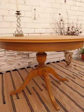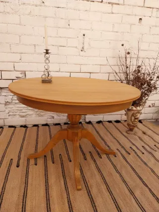 Mesa de madera maciza redonda extensible totalmente restaurada. Trabajos hechos: decapado del barniz antiguo mediante procedimientos laboriosos mixtos(químicos y mecanicos) ; madera tratada posterior con cera en tono roble claro y la encimera con barniz poliuretanico mate. Dimensiones: 112cm diámetro, extendida 150 cm. Se hacen envíos. Mueble , moble, muebles restaurados, mobles restaurats, silla , cadira, mesa, escritorio, escriptori, decoración, decoració, antiguos, antics, antiguas, antiga, vintage