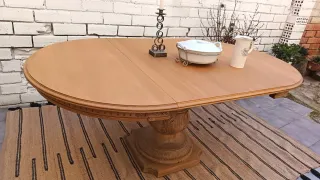 Mesa antigua de madera maciza roble, totalmente restaurada. Trabajos hechos: decapado mediante procedimientos laboriosos mixtos( químicos y mecánicos), tratamiento posterior de la madera con cera, encimera acabada en barniz poliuretanico mate. Dimensiones : 110 cm diámetro + 70 cm!! de alargo, 180 cm en total extendida. Se hacen envíos. Mueble , moble, muebles restaurados, mobles restaurats, silla , cadira, mesa, escritorio, escriptori, decoración, decoració, antiguos, antics, antiguas, antiga, vintage