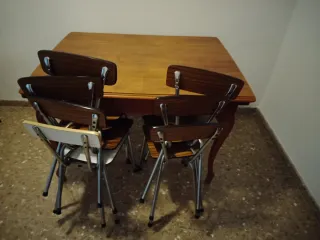Conjunto de mesas extensibles y siete sillas con estructura de formica. - Mesas de madera con extensión. - Sillas con asientos y respaldos de formica. - Patas metálicas. Interesa sacarlo rápido,
