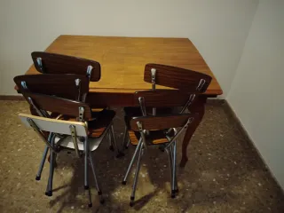 Conjunto de comedor de alta calidad compuesto por una mesa extensible de madera maciza y seis sillas a juego. Material: Madera maciza, muy robusta y duradera. Medidas mesa (aproximadas): Largo 160 cm (cerrada) / 220 cm (abierta) x Ancho 90 cm x Alto 75 cm. Extensible: Sistema sencillo de apertura para aumentar la superficie y acoger hasta 8 comensales cómodamente. Sillas: 6 sillas de madera maciza con asiento confortable. Estado: Muy bien cuidado, sin daños estructurales. Solo señales de uso en las sillas. Marca de calidad: Actualmente solo la mesa nueva de esta marca supera los 700 €. Entrega: Lleida, La Bordeta