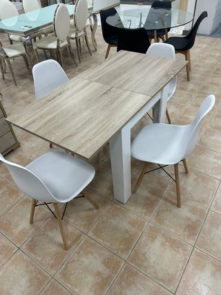 INFO: 690*638*186 - Raquel Garcia Atendemos Whatsapp Nueva mesa extensible modelo FEROE con 4 sillas nordicas, fabricada en melamina reforzada de alta calidad, bastante practida ideal para comedor o cocina Medidas: largo 67cm (cerrado) y 134 cm (abierto) x 67 cm (ancho) x 78cm (alto) - Nuevas con 2 años de garantia - Envios contra reembolso